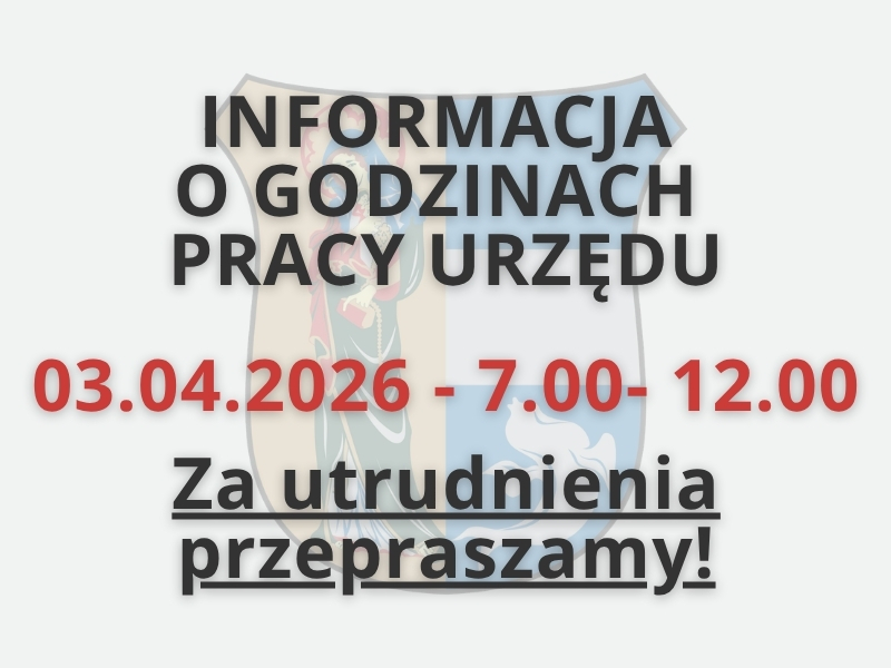 Informujemy, że w dniu 03.04.2026 r. (wielki piątek) urząd będzie czynny w godzinach 7:00–12:00. Za utrudnienia przepraszamy i dziękujemy za wyrozumiałość.
