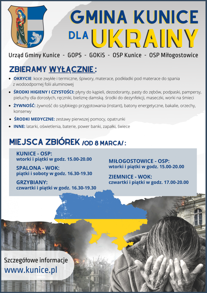 Wojna to cierpienie setek tysięcy ludzi potrzebujących pomocy, w tym również wsparcia materialnego. Dlatego. w związku z wydarzeniami, które mają miejsce na Ukrainie, Gmina Kunice włączyła się w zbiórkę najpotrzebniejszych produktów, które będą transportowane do teren Ukrainy.
