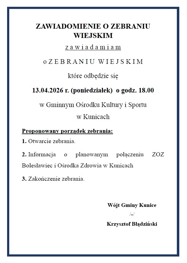 zawiadamiamy o Zebraniu Wiejskim, które odbędzie się:
